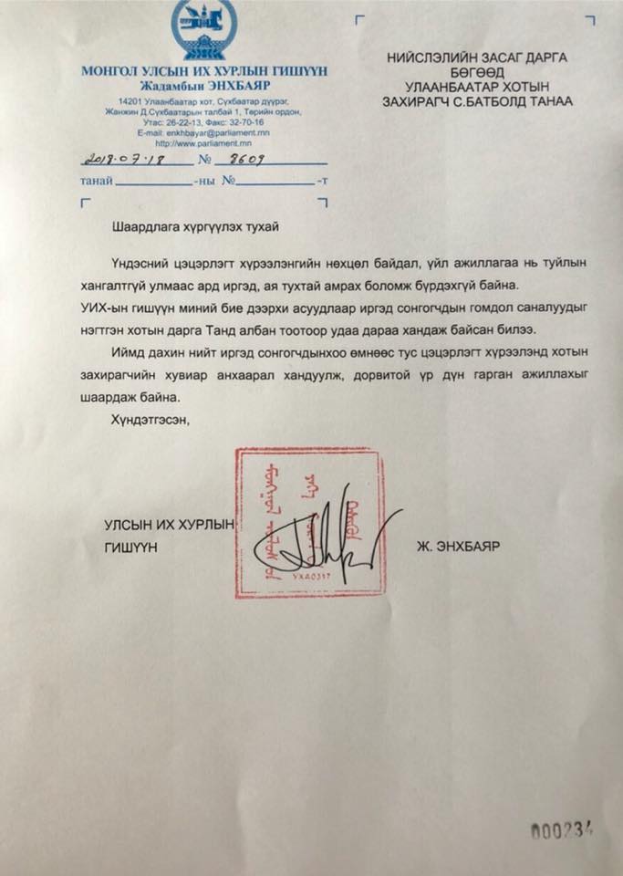 УИХ-Н ГИШҮҮН Ж.ЭНХБАЯР ҮЦХ-Н ТАЛААР ХОТЫН ДАРГАД ШААРДЛАГА ХҮРГҮҮЛЛЭЭ.