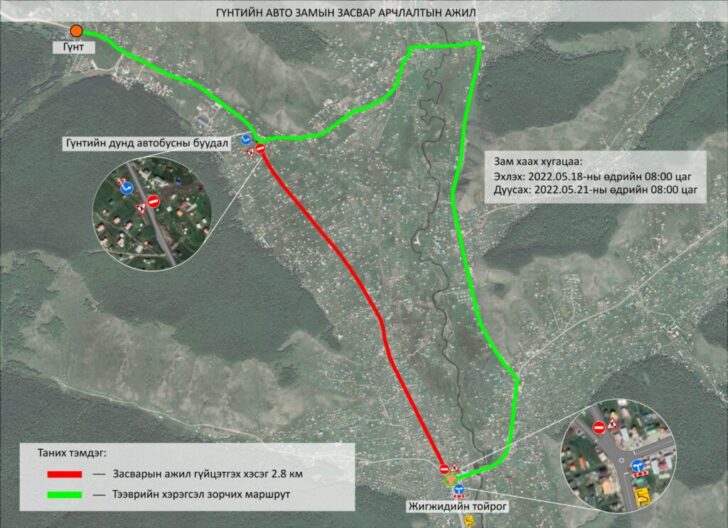 Чингэлтэй дүүрэг, 19-р хороо Гүнтийн авто замын тээврийн хэрэгслийн хөдөлгөөнийг хязгаарлан 2022 оны тавдугаар сарын 18-ны 08 цагаас 2022 оны тавдугаар сарын 21-ний 08.00 цаг хүртэл зам засвар арчлалтын ажил гүйцэтгэнэ. Иймд иргэд жолооч та бүхэн бусад замыг сонгон хөдөлгөөнд оролцоно уу.