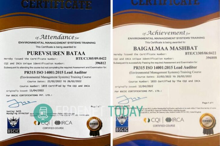 Эрдэнэт үйлдвэрийн Ерөнхий захирлын А/94 тоот тушаалаар Монголын стандарт, чанарын хүрээлэн болон Олон улсын CQI-IRCA- “Баталгаат аудиторуудын олон улсын бүртгэл”-ийн байгууллагын итгэмжлэгдсэн сургалтын түнш Энэтхэг улсын BSCIC (Бизнесийн тогтолцооны нийцлийн шударга баталгаажуулалт) байгууллагатай хамтран ISO 14001:2015 Байгаль орчны менежментийн тогтолцоонд анхдагч, хоёрдогч, гуравдагч талын аудитыг ISO 19011:2020 стандартын дагуу төлөвлөх, явуулах, тайлагнах талаар мэдлэг олгох сургалт боллоо. Уг сургалтад БОНХХ-ийн ногоон хөгжил, нөхөн сэргээлтийн албаны дарга Б.Пүрэвсүрэн, Чанарын хяналтын хэлтсийн чанарын мэргэжилтэн М.Байгалмаа нар оролцжээ. Энэхүү ISO 19011:2020 стандартыг үйлдвэрлэлд нэвтрүүлэх олон улсад хүлээн зөвшөөрөгдсөн тэргүүлэх аудиторын таван жилийн эрх бүхий сертификатыг мэргэжилтэн М.Байгалмаад олгов.