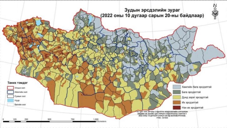 Ус цаг уур, орчны судалгаа мэдээллийн хүрээлэнгээс ган зуншлага, цас зуд, бэлчээртэй холбоотой газрын ажиглалтын болон хиймэл дагуулын олон төрлийн мэдээг нэгтгэн боловсруулж, зудын эрсдэлийн зураглалыг гаргасан байна.