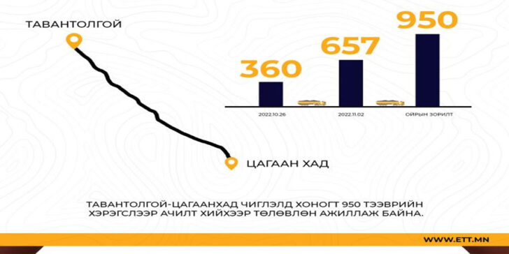Төлөвлөгөөний дагуу Тавантолгойн уурхайгаас Цагаанхад чиглэлд ачилт хийх тээврийн хэрэгслүүдийн тоог нэмэгдүүлэн, хоногт 360 тээврийн хэрэгсэл гарах квоттой байсныг 650 гаруй болгож Гашуунсухайтын авто замд үүсээд байсан тээврийн хэрэгслийн цуваа бүхий түгжрэлийг бүрэн арилгалаа. Цаашид нүүрс тээврийн тоог хоногт 950 болгон нэмэгдүүлэхээр зорилт тавин ажиллаж байна.