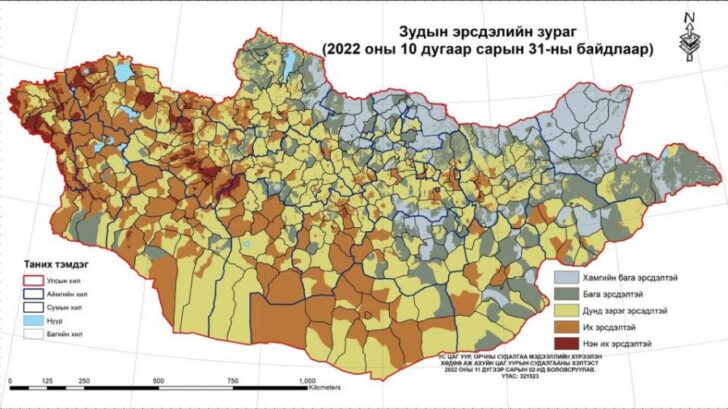 Ус цаг уур, орчны судалгаа мэдээллийн хүрээлэнгээс аравдугаар сарын 31-ний байдлаар гаргасан зудын эрсдэлийн зургаас үзвэл нийт нутгийн 30 орчим хувьд их, 40 хувьд нь дунд зэрэг эрсдэлтэй байгаа бол 20 орчим хувьд бага, 10 гаруй хувьд хамгийн бага эрсдэлтэй байна.