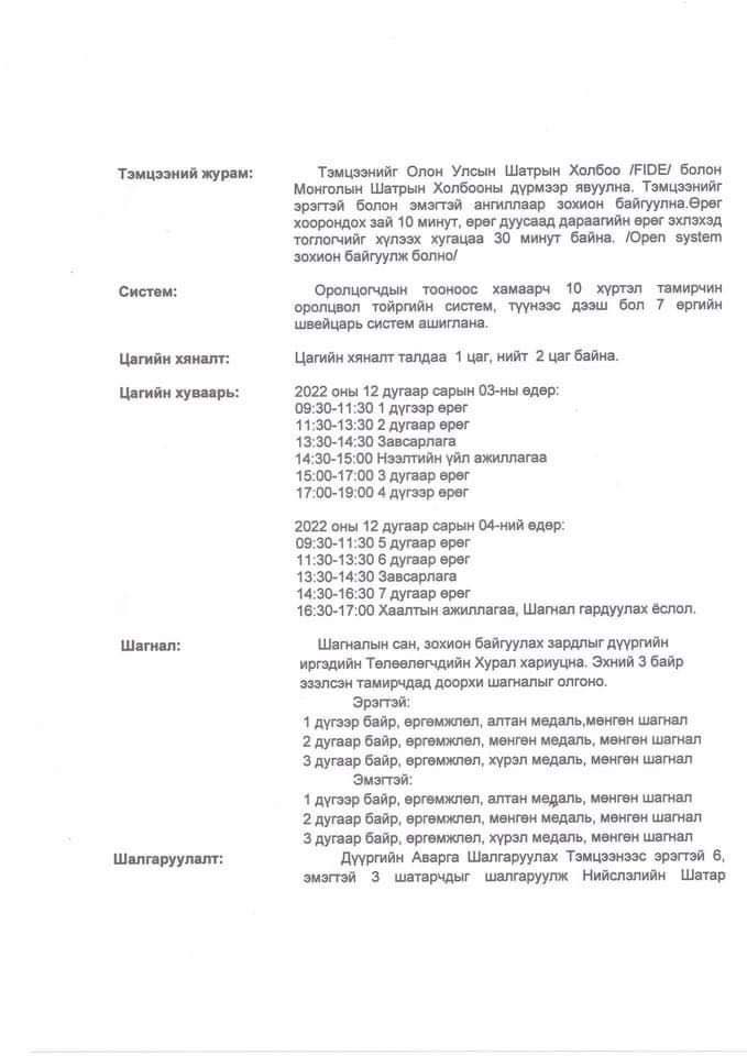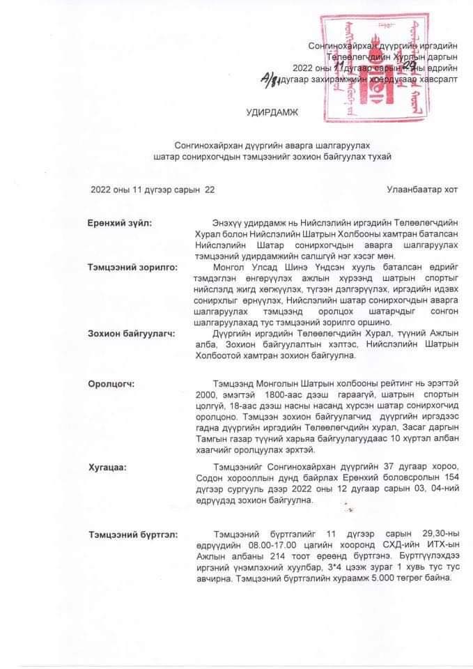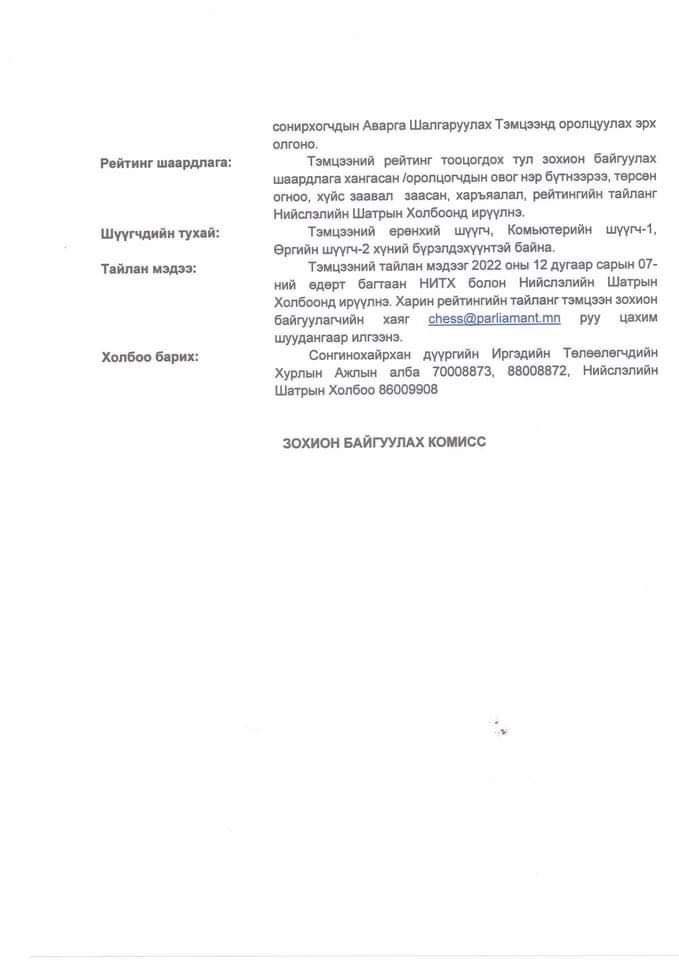 Монгол Улсад шинэ Үндсэн хууль батлагдсан өдрийг тохиолдуулан Сонгинохайрхан дүүргийн иргэдийн Төлөөлөгчдийн Хурлын даргын нэрэмжит шатар сонирхогчдын дүүргийн аварга шалгаруулах тэмцээн шатрын спортыг дүүргийн нутаг дэвсгэрт жигд хөгжүүлэх, түгээн дэлгэрүүлэх, иргэдийн идэвх оролцоог нэмэгдүүлэх, эргэх холбоог спортын арга хэмжээгээр дамжуулан бэхжүүлэх зорилгоор 2022 оны 12 дугаар сарын 03, 04-ний өдрүүдэд ерөнхий боловсролын 154 дүгээр сургуулийн Урлаг танхимд (СХД-ийн 37-р хороо, Содон хороололд байрладаг) 09:00 цагт зохион байгуулагдана.ХАМРАХ ХҮРЭЭ, ТАВИГДАХ ШААРДЛАГА: