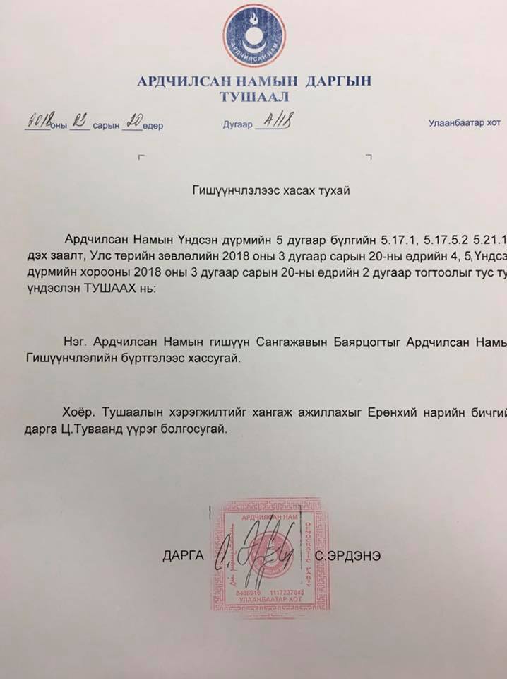 Ардчилсан намаас дөнгөж сая мэдээлэл хийлээ. Хэвлэлийн хуралд АН-ын Ерөнхий нарийн бичгийн дарга Ц.Туваан, нарийн бичгийн дарга О.Магнай, Хуулийн газрын дарга Д.Батхуяг нар оролцож, сэтгүүлчдэд мэдээлэл өгсөн юм.