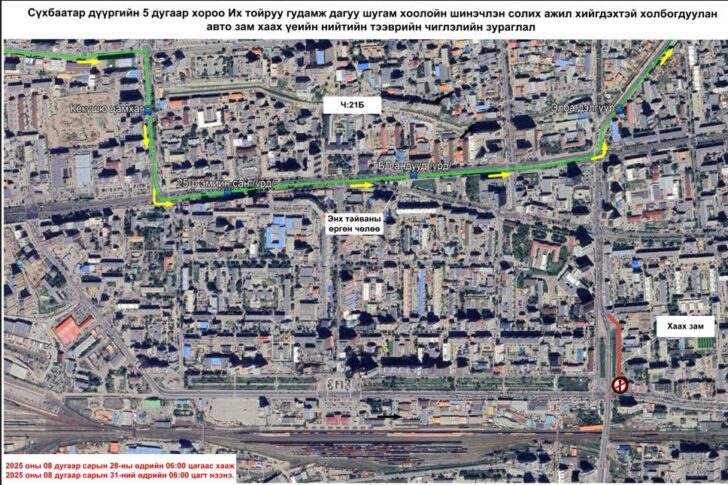 Авто зам хаах үеэр нийтийн тээврийн Ч:21Б Вокзал – Дэнжийн 1000 эцэс, Ч:22 Шадивлан-Чингис СООСЭ чиглэлийн автобус дараах замаар иргэдэд үйлчилнэ гэж Нийтийн Тээврийн Бодлогын Газраас мэдээллээ.