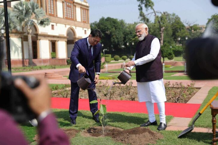 Ерөнхийлөгч У.Хүрэлсүх, Ерөнхий сайд Н.Моди нар дурсгалын мод тарьсны дараа ганцаарчилсан уулзалт, албан ёсны хэлэлцээ хийж байна.