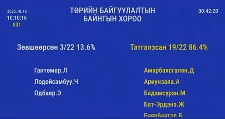 Санал хураалтад нийт 22 гишүүн оролцсоноос нийт гишүүдийн 86.4 хувийн саналаар санал дэмжигдсэнгүй.