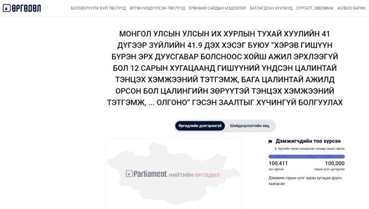 Санал хураалтын хугацаа энэ сарын 28-нд дуусах бөгөөд иргэдийн оролцоо идэвхтэй үргэлжилж байна. Та өргөдөлд дэмжлэг үзүүлэхийг хүсвэл дараах холбоосоор орж гарын үсгээ өгөх боломжтой. D.Parliament.mn