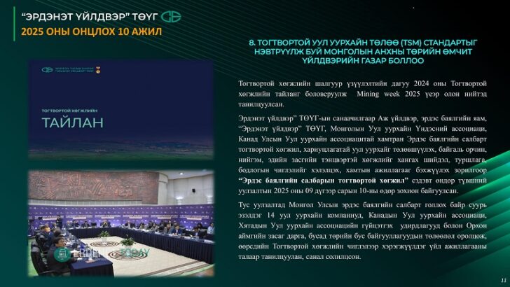 Уул уурхайн салбарын тогтвортой хөгжлийн шаардлага өсөн нэмэгдэж буй энэ үед “Эрдэнэт үйлдвэр” ТӨҮГ нь “Тогтвортой уул уурхайн төлөө” стандартыг хэрэгжүүлэх ажлыг эхлүүлсэн Монголын анхны төрийн өмчит үйлдвэрийн газар боллоо. Энэ хүрээнд Эрдэс баялгийн салбарт тогтвортой хөгжил, хариуцлагатай уул уурхайг төлөвшүүлэх, байгаль орчин, нийгэм, эдийн засгийн тэнцвэртэй хөгжлийг хангах, хамтын ажиллагааг бэхжүүлэх зорилгоор “Эрдэс баялгийн салбарын тогтвортой хөгжил” сэдэвт өндөр түвшний уулзалтыг Монгол Улсын Засгийн газар, Аж үйлдвэр, эрдэс баялгийн яам, “Эрдэнэт үйлдвэр” ТӨҮГ, Монголын Уул уурхайн Үндэсний ассоциаци, Канад Улсын Уул уурхайн ассоциаци хамтран Эрдэнэт хотноо анх удаа амжилттай зохион байгууллаа.