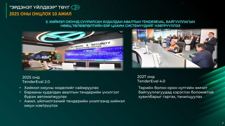 Байгууллагын нөөц төлөвлөлтийн ERP системийг дотоодын нөөц бололцоогоор хөгжүүлж нэвтрүүлэх төслийн үр дүнд Худалдан авалт, хүний нөөц, баримт бичиг, гэрээ, цаг бүртгэл, чанарын хяналтын модулиуд 100 хувь бүрэн нэвтэрч, Санхүү, агуулах, цалин, ХАБЭА-ын хөгжүүлэлтүүд 30-80 хувийн гүйцэтгэлтэй, Системийн интеграци амжилттай хийгдэж, олон төрлийн дотоод, гадаад системүүдтэй холбогдсон бөгөөд Худалдан авалт, Хүний нөөц зэрэг үндсэн үйл ажиллагааны процессууд бүрэн автоматжсан. Худалдан авалтын үйл ажиллагааны үр ашгийг дээшлүүлэх, ил тод байдлыг хангах, хүний хүчин зүйлээс үүдэлтэй алдааг бууруулах, авлига, ашиг сонирхлоос ангид байх зорилгоор хиймэл оюун ухаанд суурилсан тендерийн үнэлгээний системийг нэвтрүүлэх судалгааны ажлыг 2022 оны 8 дугаар сараас эхлүүлж 2024 онд туршилтын байдлаар нэвтрүүлж, 2025 оны 07 сарын 07-ны өдрөөс үйл ажиллагаандаа бүрэн ашиглаж эхэлсэн. TenderEval систем нь үйлдвэрийн газрын ERP системтэй нягт уялдан ажилладаг бөгөөд худалдан авах үйл ажиллагааны бүх процесс цахим хэлбэрээр зохион байгуулагдаж байна.