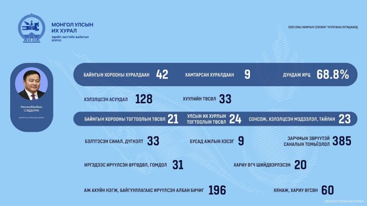 Монголбанкны Ерөнхийлөгчийн албан тушаалд нэр дэвших нэр дэвшигчийн сонсголыг зохион байгуулав. Нэр дэвшигчийн сонсголын үйл ажиллагаа 2025 оны 11 дүгээр сарын 25-ны өдөр “Нэр дэвшигчийн сонсголын тов тогтоох, сонсгол даргалагчийг сонгох тухай” тогтоолыг Байнгын хорооноос баталснаар эхэлж, 12 дугаар сарын 17-ны өдөр нэр дэвшигчийн сонсголыг зохион байгуулсан юм. Түүнчлэн Санхүүгийн зохицуулах хорооны дарга, орон тооны бус гишүүн, Хяналтын зөвлөлийн дарга, гишүүн, Монголбанкны Мөнгөний бодлогын хорооны орон тооны бус гишүүн, Монголбанкны Хяналтын зөвлөлийн дарга, гишүүн, Үндэсний статистикийн хорооны зөвлөлийн гишүүнд нэр дэвшигчийн сонсголыг зохион байгуулсан байна. Нэр дэвшигч сонгон шалгаруулах үйл ажиллагаа хоёр сар гаруй үргэлжилж, нэр дэвшихээр ирүүлсэн 45 хүсэлтээс 20 албан тушаалд нэр дэвших хүсэлтийг сонгон шалгаруулжээ. Улмаар холбогдох нэр дэвшигчийн сонсголуудыг зохион байгуулж, Улсын Их Хурлын эрхлэх асуудлын хүрээний харьяа байгууллагын удирдах албан тушаалд томилуулахаар нэр дэвшүүлсэн байна. Бүрэн эрхийн хугацаа дуусгавар болсноос хойш, эдгээр албан тушаалуудад хуульд заасны дагуу 3-8 жилийн турш томилгоо хийгээгүй, үйл ажиллагаа зогсонги байдалд орсон байсныг Улсын Их Хурал энэхүү бүрэн эрхийнхээ хугацаанд шийдвэрлэн томилгоог хийж, үүсээд байсан гажуудлыг арилгасан.
