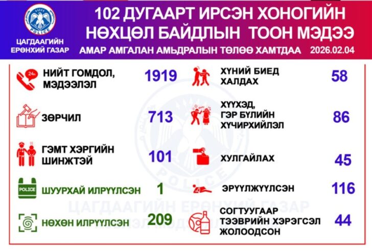 Цагдаагийн байгууллагын 102 тусгай дугаарт өчигдөр буюу 2026 оны 02 дугаар сарын 04-ний өдөр нийт 1919 дуудлага, мэдээлэл бүртгэгдсэнээс зөрчлийн шинжтэй 713, гэмт хэргийн шинжтэй 101 дуудлага, мэдээлэл байна.
