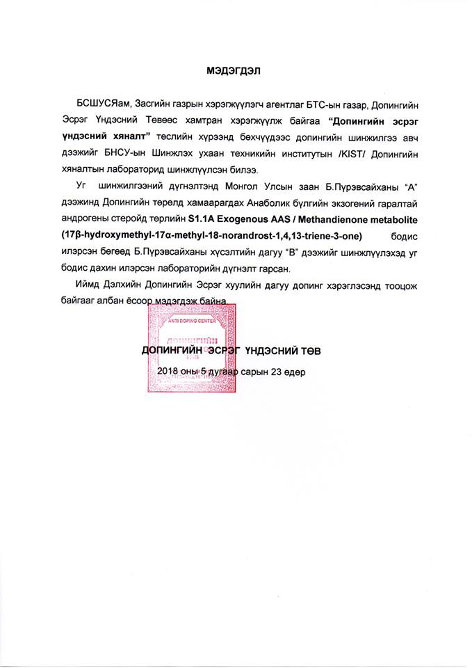 Тодруулбал, БНСУ-ын Допингийн хяналтын лабораториос ирүүлсэн шинжилгээний дүгнэлтэд: