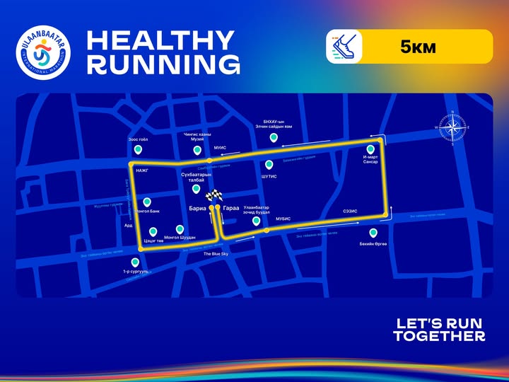 Түүнчлэн 1.5 км болон 5 км-ийн зайд оролцогчдын энгэрийн дугаарыг дараах байршлуудад тавдугаар сарын 1-15-ны 09:00-17:00 цагийн хооронд олгоно.