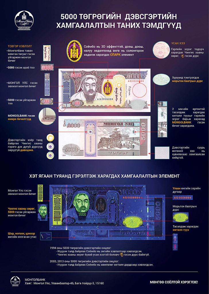Энэ зорилтын хүрээнд эхний ээлжинд нөөцийг нь дахин бүрдүүлэх хугацаа нь болсон 5000 төгрөгийн дэвсгэрт дээр ажиллаж, олон улсын хэмжээнд судалгаа хийсний үндсэн дээр сүүлийн үеийн шинэ технологиор хийгдсэн элементийг уг дэвсгэртэд оруулан сайжруулж шинэчилсэн хувилбарыг гаргах арга хэмжээг аваад байна. Ийм төрлийн хамгаалалтын таних тэмдгийн гол шинж чанар нь хуурамчаар хийх бараг боломжгүй технологи буюу дуурайлган хийх тохиолдолд өндөр зардалтай байх явдал байдаг.