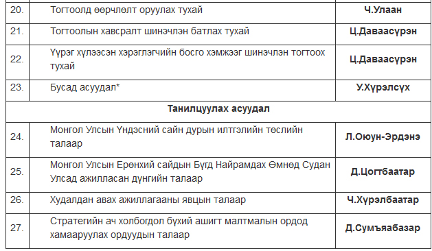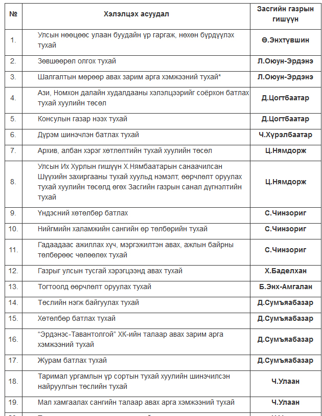 Улсын нөөцөөс улаан буудайн үр гаргаж, нөхөн бүрдүүлэх тухай, Ази, Номхон далайн худалдааны хэлэлцээрийг соёрхон батлах тухай хуулийн төсөл, Консулын газар нээх тухай, Архив, албан хэрэг хөтлөлтийн тухай хуулийн төсөл, Нийгмийн халамжийн сангийн өр төлбөрийн талаар хэлэлцэх юм. Мөн гадаадаас ажиллах хүч, мэргэжилтэн авах, ажлын байрны төлбөрөөс чөлөөлөх тухай, “Эрдэнэс-Тавантолгой” компанийн талаар авах зарим арга хэмжээний тухай, Таримал ургамлын үр сортын тухай хуулийн шинэчилсэн найруулгын төслийн тухай хэлэлцэхээр төлөвлөжээ.