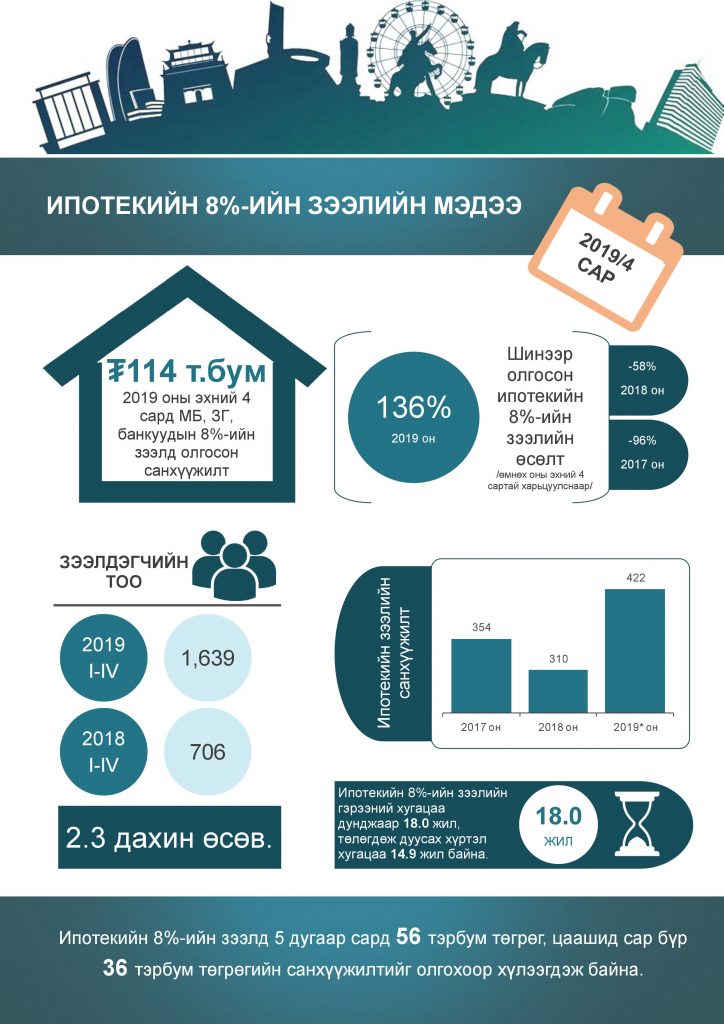 Өнгөрсөн онд ипотекийн зээлийн хөтөлбөрийн санхүүжилтийн нөхцөлд нэмэлт, өөрчлөлт оруулснаар Засгийн газраас банкуудад олгох орон сууцны ипотекийн зээлийн эх үүсвэрийн хүүг 1 хувь болгон бууруулж, банкууд өөрийн эх үүсвэрээс 8 хувийн хүүтэй ипотекийн зээлийг Засгийн газрын олгож буй эх үүсвэрээс багагүй хэмжээгээр санхүүжүүлэх шийдвэр гаргасан. Энэ хүрээнд 2019 онд Монголбанкнаас 200-220 тэрбум, Засгийн газар болон банкуудын өөрийн эх үүсвэрээс тус бүр 115 тэрбум төгрөгийг ипотекийн 8 хувийн зээлд олгосноор 2019 онд нийт 430 тэрбум төгрөгийн санхүүжилтийг олгохоор байна. Улмаар 2019 онд шинээр олгох ипотекийн зээлийн хэмжээ 2018 онтой харьцуулахад 120 тэрбум төгрөг буюу 40 орчим хувиар нэмэгдэх төлөвтэй байна.