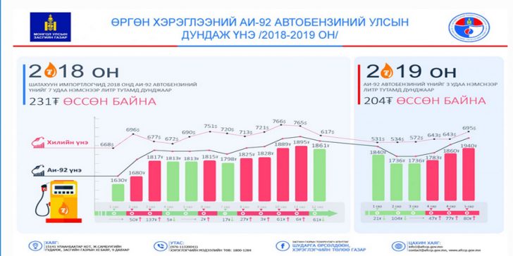 Тухайлбал, 2019 онд шатахууны худалдаа эрхлэгчид шатахууны жижиглэнгийн борлуулалтын үнийг 2019 оны 4 дүгээр сард 2 удаа, 5 дугаар сард 1 удаа нэмэгдүүлснээр 2019 оны 3 дугаар сарын үнэтэй харьцуулахад литр тутамдаа дунджаар 97-161 төгрөгөөр нэмэгдсэн.